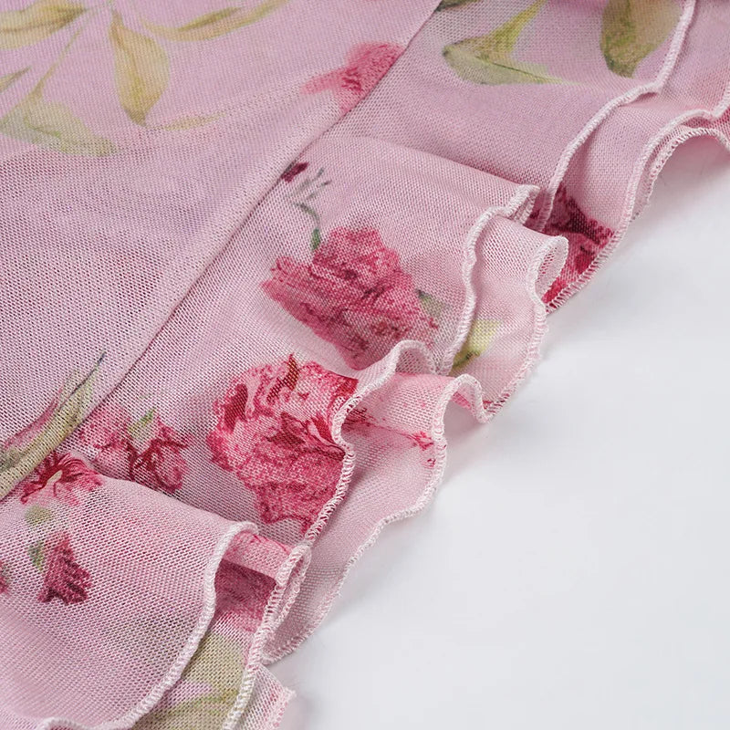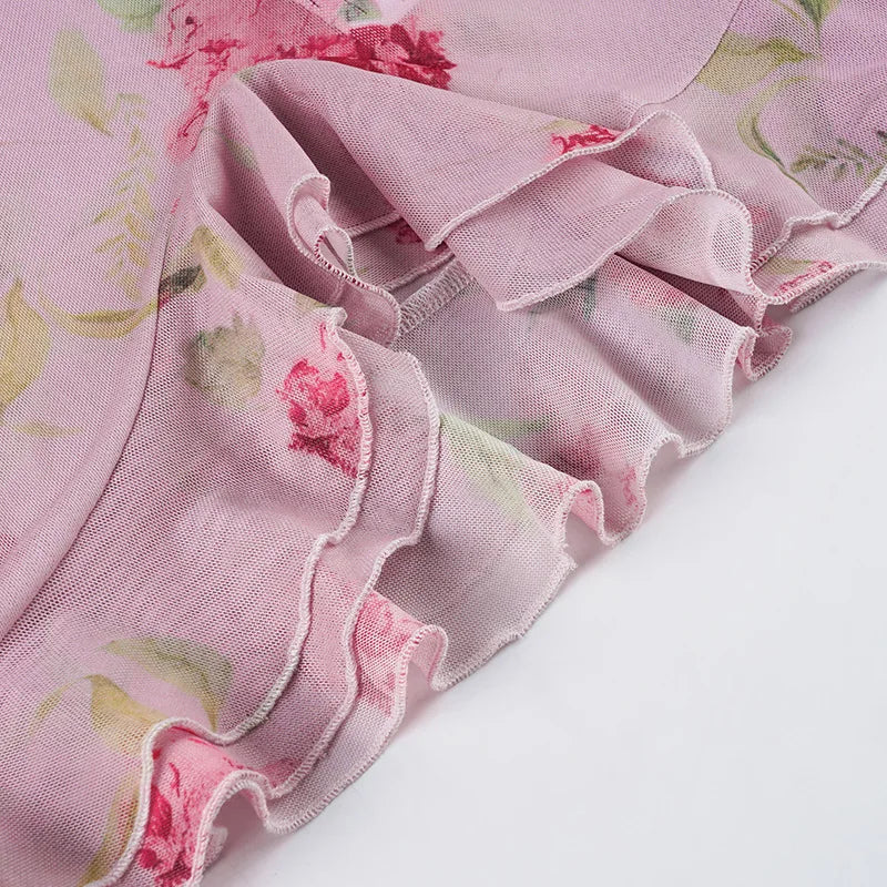 Pink Floral See Through Mesh Ruffled V-Neck Backless Top